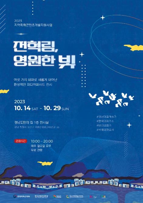 먼저 도민의 집 전시장에서는 경남 대표 화백 전혁림 작품을 전혁림, 영원한 빛이란 주제로 6가지 테마(?빛나는 예술의 혼, ?삶의 희망과 원천, ?소년의 순수한 시선, ?코발트블루 바다의 화가, ?전통에 감탄하다, ?색채의 마술사 끝없는 열정)로 구성하여 실감 콘텐츠로 새롭게 태어난 미디어파사드 전시를 진행한다.