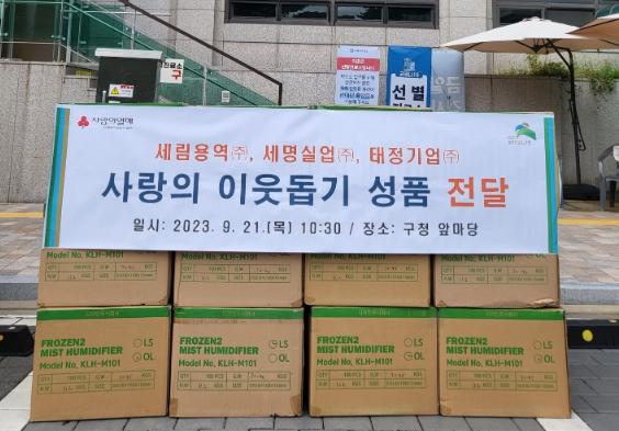 세림용역(주), 세명실업(주), 태정기업(주)은 금 1,000만 원 상당 가습기 2,500개를 전달했다. 이는 관내 저소득 가구 및 사회복지시설에 지원됐다.