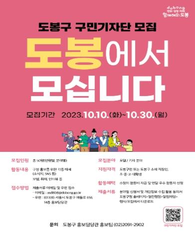 도봉구민 또는 도봉구 소재 직장인이나 초·중·고·대학교에 재학 중인 학생이면 누구나 도봉구 구민기자단에 참여할 수 있으며, 참여를 원하는 구민은 10월 10일부터 10월 30일까지 도봉구 홈페이지에서 지원서 등을 내려받아 작성한 뒤 담당자 이메일 또는 도봉구 홍보담당관으로 우편 신청하면 된다.