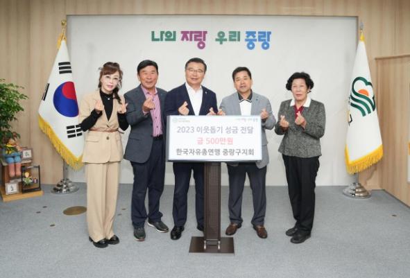 중랑구가 6일 오후 한국자유총연맹 중랑구지회(지회장 김왕규)로부터 지역 어르신들을 위한 성금 5백만 원을 전달받았다.
