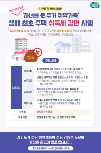 부부합산소득이 1억 원 이하이고 자녀가 1명 이상 있는 도민이 4억 원 이하 경기도 주택을 생애 최초로 구입할 경우 취득세 전액을 면제받는다.