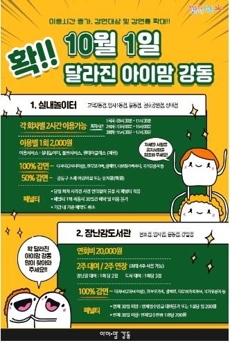 또한, 구는 공공형 실내놀이터의 지속적인 확대를 위해 10월 1일부터 서울시 운영기준에 맞춰, 영유아 입장료 2,000원(보호자 무료)을 부과하고, 입장료 감면대상 및 감면율을 확대해 ▲다자녀, 장애인, 한부모, 국가유공자 등은 100% ▲강동구 소재 어린이집 또는 유치원(학원)을 다닐 시 50% 감면을 적용하고 있다. 감면받고자 하는 경우, 관련 증명서(복지카드, 신분증, 주민등록등본 등)를 지참하고 지점에 방문하면 할인 적용 받을 수 있다.