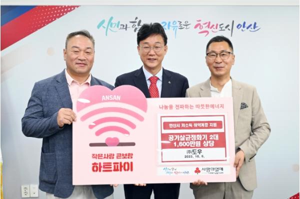 안산시는 지난 6일 (주)도우로부터 관내 사회복지시설을 위한 공기살균정화기 2대(1천600만원 상당)를 기탁 받았다고 10일 밝혔다.