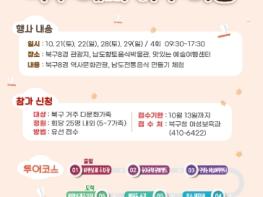 ‘북구에서 하루여행’은 지난해 북구가 장기간 지속된 코로나19로부터 다문화가족의 일상회복을 지원하고자 기획한 프로그램으로 우리나라 역사?문화 이해에 도움 되는 북구의 대표 관광자원 일일 여행을 통해 다문화에 대한 공감과 더불어 거주 외국인의 지역사회 안정적 정착을 도모하는 것이 사업의 골자이다.