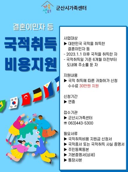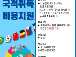 자격요건은 23년 1월 1일 이후 국적을 취득해 취득일 기준 6개월 이전부터 군산에 주소를 둔 자로, 국적 취득일로부터 2년 내 신청할 수 있으며, 국적 취득비용 30만원을 지원한다.