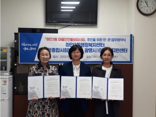 하안3동행정복지센터는 지난 12일 지역 복지기관인 하안종합사회복지관, 광명시 1인가구지원센터와 ‘하안3동 마을안전돌보미사업’ 추진을 위한 업무협약을 체결했다.