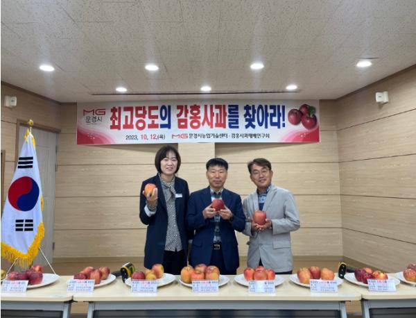 문경감홍사과재배연구회는 지난 12일 문경시농업기술센터 문경사과연구소에서 최고당도의 감홍사과를 선발하는‘최고당도 감홍사과를 찾아라’ 행사를 개최했다.