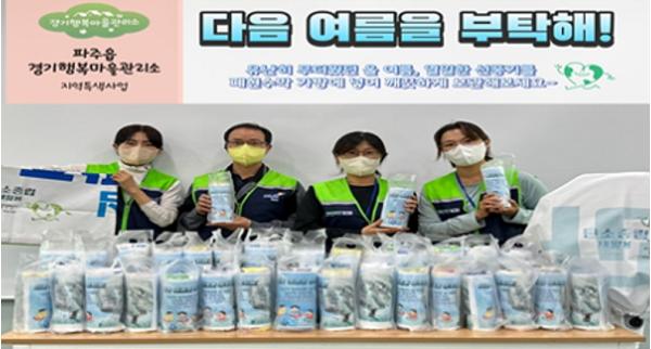 폐현수막을 재활용한 선풍기 덮개를 제작하기 위해 수거한 현수막을 세탁하고, 재봉틀 작업을 통해 봉합했으며, 선풍기 덮개의 중앙에는 행복마을관리소 로고와 전화번호 그리고 탄소중립실천 홍보문구를 새겨 개별포장을 통해 완성했다.