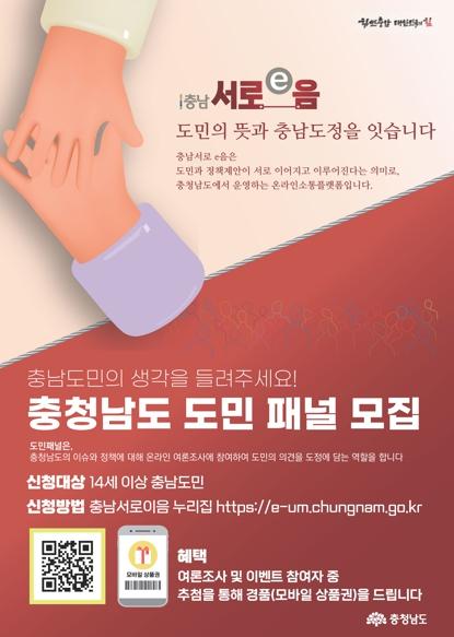패널은 충남서로이(e)음 누리집을 통해 상시 공개 모집하며, 도내 거주하는 14세 이상 도민이면 누구나 가입할 수 있다.