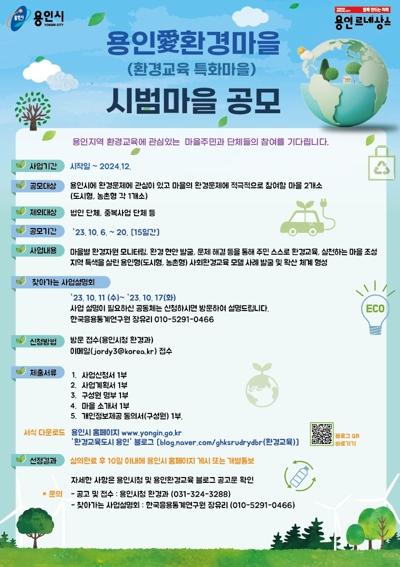 용인특례시가 마을 단위 환경교육 활성화를 위해 환경교육 특화 프로젝트 ‘용인愛(애)환경마을’에 참여할 도시형, 농촌형 마을 각각 1곳을 모집한다고 15일 밝혔다.