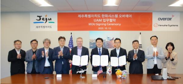 제주도는 12일 오전(현지 시각) 미국 캘리포니아주 산타아나 오버에어 본사에서 제주도-오버에어-한화시스템 3자 간 제주 UAM 산업 생태계 구축을 위한 업무 협약을 체결했다.