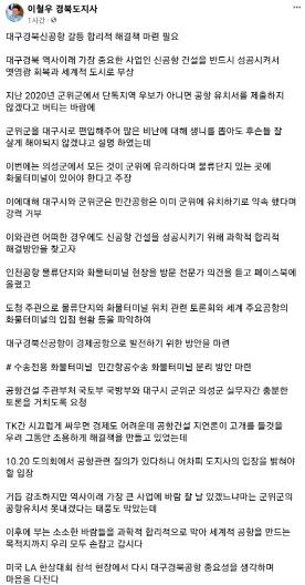 이철우 경북도지사는 페이스북을 통해 “공항 건설 주관부처들과 충분한 토론을 갖고 과학적·합리적으로 해결책을 찾아 대구경북신공항이 세계적 물류전문 경제공항으로 발전하기 위한 목적지까지 우리 모두 손잡고 갑시다”라고 밝혔다.