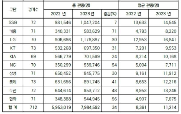 평균 관중은 11,214명으로 지난해 동일 경기 수 대비 34% 늘어났으며 10개 구단 모두 지난해와 비교해 평균 관중이 증가했다. 편성된 모든 경기를 마친 키움은 평균 관중 수가 71% 상승하여 가장 높은 상승률을 기록했으며, 한화 56%, NC 54%로 뒤를 잇고 있다.