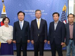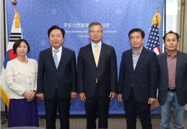 권기창 안동시장을 비롯한 안동시 방문단이 13일 주 로스앤젤레스 대한민국 총영사관을 찾아 유네스코 세계유산의 도시 안동을 홍보하고 로스엔젤레스와 문화관광 교류를 확대할 수 있도록 힘써 줄 것을 요청했다.