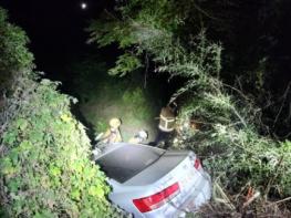 여수소방서가 15일 오후 19시경 여수시 율촌면 조화리 인근 산길에서 승용차가 비탈길을 따라 3m 아래로 추락하는 사고가 발생했다.