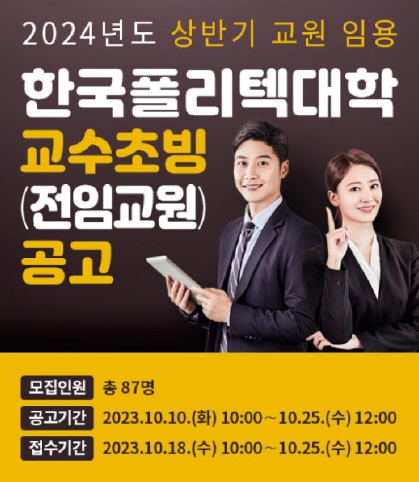 이번 교수 초빙에는 '고등교육법'과 '국민 평생 직업능력 개발법'에 따른 교원 자격 기준에 해당하고, 3년 이상 현장 실무경력을 갖춘 누구나 지원할 수 있다. 산업체, 교육·연구 경력 등을 종합적으로 평가해 선발한다. 원서접수는 이달 18일 오전 10시부터 25일 오후 12시까지다. 임용은 2024년 2월 예정이다. 자세한 내용은 대학 홈페이지(kopo.ac.kr)에서 확인하면 된다.