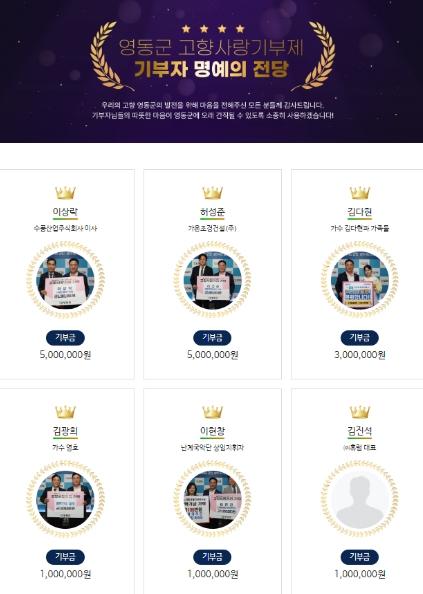 충북 영동군은 영동군청 홈페이지 누리집에 ‘영동군 고향사랑기부제 기부자 명예의 전당’을 개설했다고 16일 밝혔다.