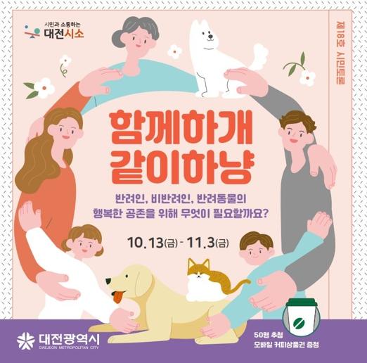 대전시는 정책제안 플랫폼 ‘대전시소’에서‘탄소중립포인트제가 확산되려면 어떻게 해야 할까요?’와‘반려인과 비반려인, 반려동물의 행복한 공존을 위해 무엇이 필요할까요?’라는 주제로 온라인 공론장을 연다.