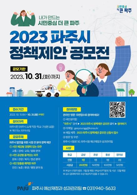 파주시는 시민의 의견을 파주시 정책에 반영하고 시민과 소통하는 ‘시민중심 더 큰 파주’를 실현하기 위해 ‘2023 파주시 정책제안 공모전’을 개최한다.