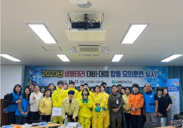남해군보건소는 올해 7월 전국적으로 발생한 독극물 의심 국제우편물 사건과 같은 생물테러 발생을 대비해 지난 13일 보건소 정신건강복지센터 1층에서 현장대응 역량강화를 위한 모의훈련을 실시했다.