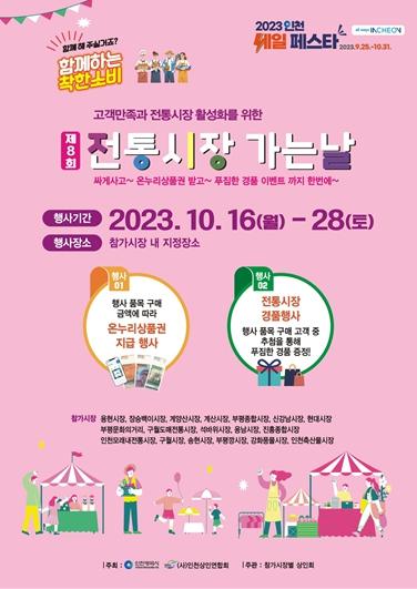 ‘전통시장 장보러 가는 날’은 전통시장 활성화와 민생안정을 위해 인천광역시와 (사)인천상인연합회(회장 이덕재)가 주최하는 행사로 올해는 ‘2023년 인천세일페스타’기간(9월 25일~ 10월 31일)에 맞춰 진행된다.