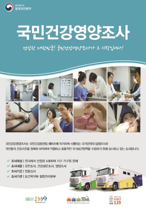국민건강영양조사는 건강설문조사, 검진조사(신체계측, 체성분검사, 혈액검사, 이비인후검사, 구강검사 등), 영양조사로 구성됐다. 조사 기간 2대의 이동 검진차량이 해당지역을 방문해 조사를 진행한다.