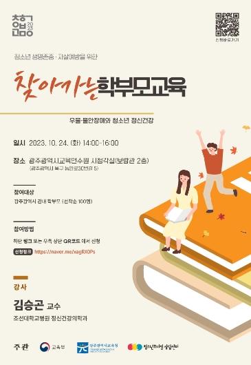광주시교육청이 오는 24일 광주교육연수원 시청각실에서 관내 학부모 대상으로 ‘청소년 생명존중·자살예방을 위한 학부모 교육’을 실시한다.
