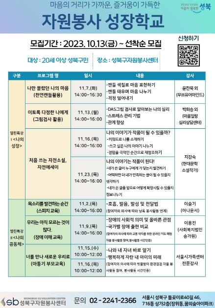 자원봉사 성장학교는 20세 이상 성북구민이면 누구나 신청 및 참여 가능하며, 온라인 구글 폼을 통해 신청하면 된다. 2023. 10. 13.(금) 부터 분야 및 회차별 선착순 모집 중이며, 수강료 및 재료비는 무료다.
