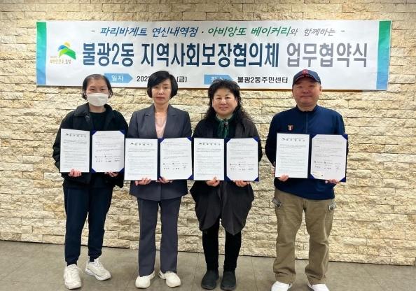 은평구 불광2동은 지난 13일 불광2동 지역사회보장협의체와 공동으로, 파리바게트 연신내역점, 아비앙또 베이커리와 ‘홀몸 어르신 등 취약계층 복지지원을 위한 업무협약’을 체결했다고 밝혔다.