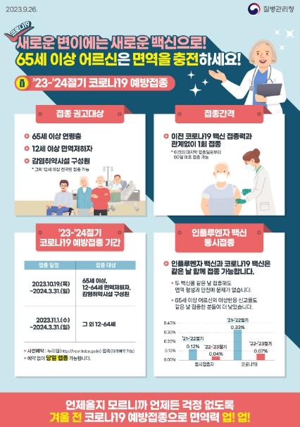 충남 서산시는 백신접종 또는 코로나19 감염 후 시간 경과에 따른 코로나19 예방 효과가 감소하고 XBB 계열 등의 변이 바이러스가 유행함에 따라 65세 이상 시민들의 코로나19 바이러스 예방접종을 당부했다.