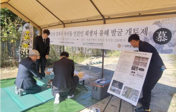 이번 발굴조사는 이러한 미수습 유해를 발굴하기 위해 마련한 것으로, 발굴조사는 16일(월)부터 진행됐다. 구는 조사에 앞서 지난 11일(수) 우이동 338번지 일대에서 유족회, 진실화해위원회 및 발굴 조사를 맡은 (재)삼한문화재연구원과 함께 유해들의 명예회복과 진실규명을 다짐하며 넋을 위로하는 위령제를 올렸다.