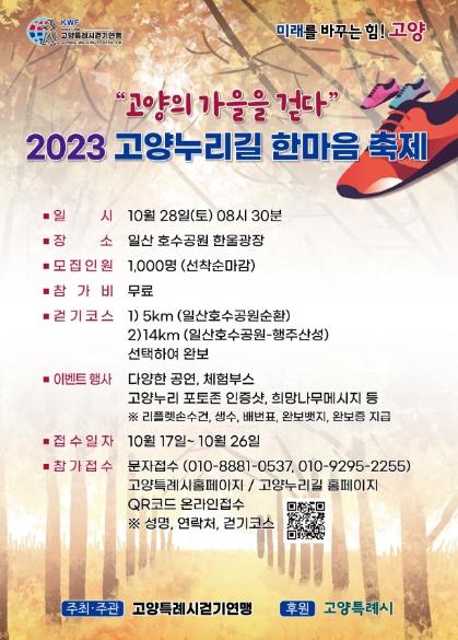 오는 28일 ‘2023 고양누리길 한마음축제’가 5년 만에 일산호수공원에서 개최된다. 고양시 대표명소인 일산호수공원, 행주산성 등을 함께 걸으며 가을의 풍광을 즐기고, 대규모 시민 참여 걷기 행사로 화합의 장을 마련한다는 계획이다.