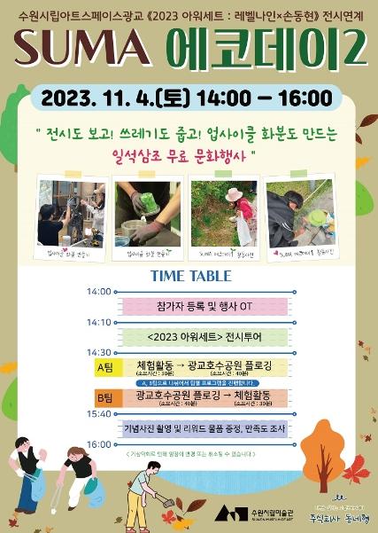 행사 참가자는 현재 수원시립아트스페이스광교에서 개최 중인 《2023 아워세트 : 레벨나인×손동현》을 도슨트 해설과 함께 관람하고, 업사이클링 기억 ‘동네형’의 플라스틱 뚜껑으로 화분을 만드는‘업사이클링 체험 활동’을 참여한다. 이후 직접 광교호수공원에서 산책하며 쓰레기를 줍는 플로깅 활동을 진행하며 'SUMA 에코데이2' 활동지를 작성하는 순서로 진행된다.