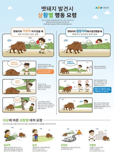멧돼지와 가까이 마주쳤을 때는 등을 보이고 뛰거나 소리치는 행위를 절대 금지해야 하고, 침착하게 천천히 옆으로 이동하여 가까운 나무 등 은폐물 뒤로 몸을 피한 뒤 경찰(112), 소방(119)과 구청에 신고해야 한다.