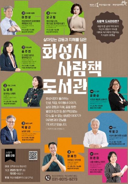 화성시 사람책은 작가, 군인, 가죽공예가 등 다양한 직업군의 재능기부자 9명으로 구성되어 있다. 독자들은 읽고 싶은 사람책을 선택하여 자유로운 대화를 나누며, 종이책에서는 다 느낄 수 없는 생생한 경험과 생각을 들을 수 있다. 궁금한 내용을 현장에서 바로 질문할 수 있어 더욱 유익한 시간이 될 것이다.