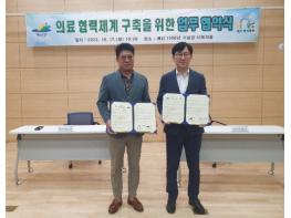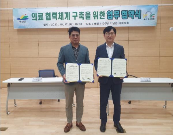 예산군 1100년 기념관은 지난 17일 예산 1100년 기념관 다목적홀에서 예산명지병원과 의료분야 업무협약을 맺고 수영장 등 이용객에게 의료혜택을 제공키로 뜻을 모았다.