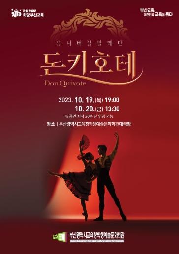 부산광역시교육청학생예술문화회관은 오는 10월 19, 20일 이틀간 회관 대극장에서 학생 800명과 교직원 900명을 대상으로 유니버설발레단의 ‘돈키호테’발레 공연을 개최한다.