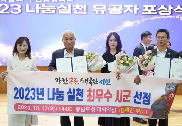 지난 17일 충남도청 대회의실에서 열린 2023년 나눔 실천 유공자 포상식이 열린 가운데 공주시는 ‘희망2023 나눔 캠페인’ 부문에서 지역사회 복지 발전과 나눔 문화 기반 조성 등에 크게 이바지한 공로로 최우수 시군으로 선정돼 충남도지사상을 받았다.