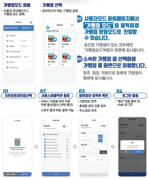 기존 회원(사용자 및 가맹점주)은 플레이스토어(안드로이드) 및 앱스토어(아이폰)에서 ‘지역상품권 chak’ 신규앱 설치, 인증 후에 사용이 가능하다.