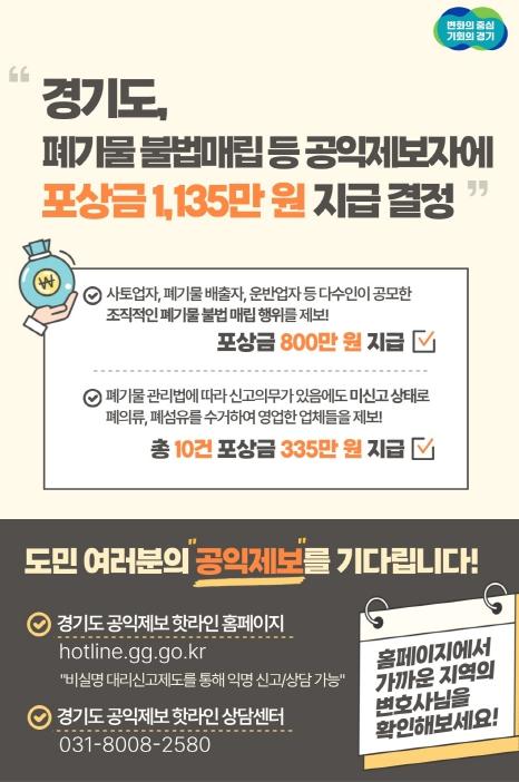 경기도는 지난 11일 2023년도 제3차 경기도 공익제보지원위원회를 열고 폐기물 불법 매립 및 미신고 폐기물 이용 영업 행위 제보 등 총 11건에 대해 포상금 1,135만 원을 지급하기로 결정했다고 19일 밝혔다.