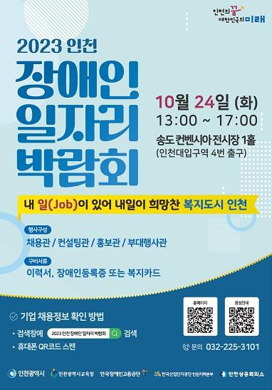 인천광역시는 10월 24일 오후 1시부터 송도컨벤시아 1층 전시홀에서 취업을 희망하는 장애인을 대상으로 ‘2023 인천 장애인 일자리 박람회’를 개최한다고 밝혔다.