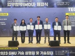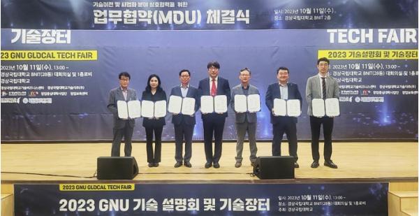 경상국립대학교에서 지난 11일 개최된 ‘2023년 GNU 기술설명회 및 기술장터’에서 (재)남해마늘연구소, 경상국립대학교 산학협력단, (재)경남항노화연구원, (재)김해의생명산업진흥원, (재)진주바이오산업진흥원, (재)하동녹차연구소, (재)창녕양파장류연구소는 상호 업무협약을 체결했다.