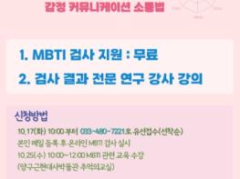 프로그램은 온라인 성격 유형(MBTI) 검사를 실시한 후 오는 25일 오전 10시부터 12시까지 양구 근현대사박물관 추억의 교실에서 성격 유형(MBTI) 검사 결과에 따른 전문 연구 강사의 강의로 진행된다.