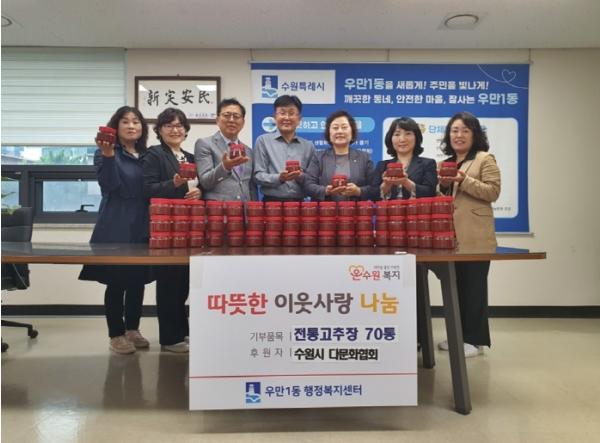지난 19일 수원시다문화협회는 수원시 새터민과 다문화가족이 함께 전통방식으로 직접 담근 고추장 70통을 우만1동에 전달했다.