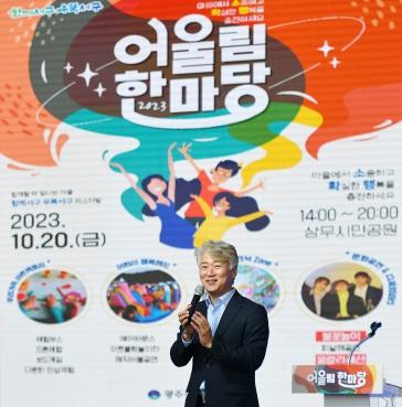서구는 20일 상무시민공원 일원에서 29만 서구민의 소통과 화합, 축제의 장인 ‘2023 어울림한마당’을 개최했다. 이날 개막식에는 강기정 광주광역시장, 김이강 서구청장, 이정선 광주시교육감 등을 비롯해 서구민 1,000여 명이 참석했으며, 주민대표인 18개 동 주민자치(위원)회장들의 공동 제안으로 ‘친절도시 선포식’이 이어졌다.