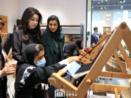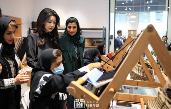 김 여사는 왕립전통예술원에서 운영 중인 돌 조각 및 도자기 제작, 전통 직조 공예 ‘알 사두’(Al Sadu) 등의 실습 현장을 둘러봤다. 특히 ‘알 사두’ 제작 과정을 보며 김 여사는 “손으로 한 땀 한 땀 만드는 정성이 느껴진다”며 감동을 전했다.