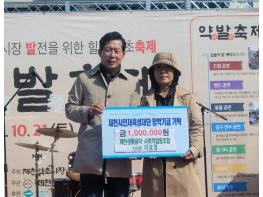 제천생활음악 사회적협동조합은 지난 21일 개최된 약초시장 발전을 위한 축제“약발축제”에서 제천시인재육성재단에 문화 예술인재 양성을 위한 장학금 100만원을 기탁했다.
