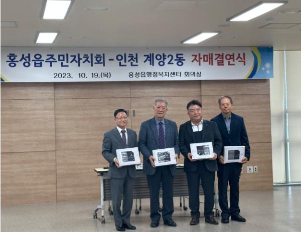 홍성읍 주민자치회와 인천 계양구 계양2동 주민자치회가 지난 19일 홍성읍 행정복지센터에서 주민자치위원 등 60여 명이 참석한 가운데 자매결연 협약식을 가졌다.