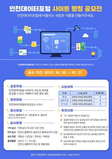 손혜영 인천시 데이터산업과장은 “대학, 연구기관, 기업, 시민이 함께 공유하고 있는 인천데이터포털이 이번 공모전을 계기로 더 많은 분들에게 알려지길 바란다”며 “기억하기 쉽고 참신한 아이디어로 인천시를 대표하는 사이트에 걸맞은 이름이 지어질 수 있도록 적극적인 참여를 부탁드린다”고 말했다.