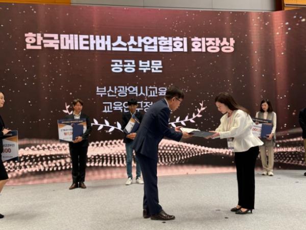 부산광역시교육청교육연구정보원은 ‘2023년 코리아 메타버스 어워드’ 공공부문에서 한국메타버스산업협회장상을 수상했다고 23일 밝혔다.